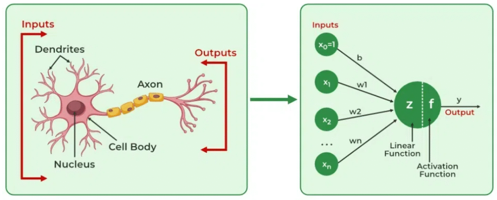 • Finally, the signal travels to the next layer of artificial neurons, just like biological neurons passing signals through synapses.