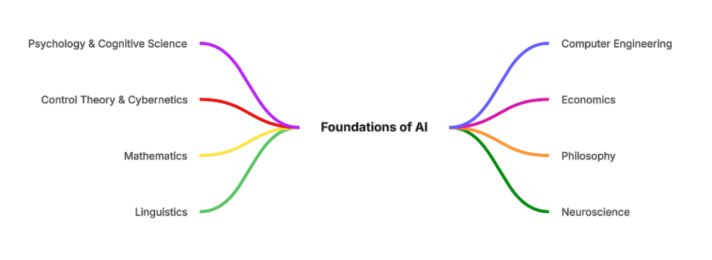 The foundations of AI come from fields such as Philosophy, Mathematics, Economics, Neuroscience, Psychology, Computer Engineering, Control Theory, and Linguistics. Each of these areas has provided ideas, theories, and techniques that shaped the development of intelligent machines.