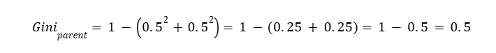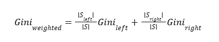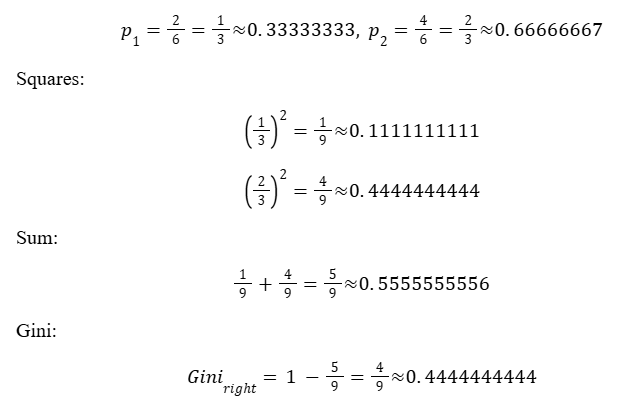 Interpretation: the split reduces impurity slightly (by ≈ 0.024). In CART we compare this decrease with other candidate splits and pick the split with the largest decrease.
